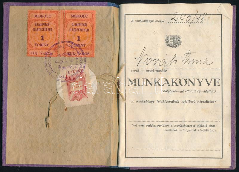 Beschreibung: 1948 Miskolc munkakönyv városi ujjáépítési illetékbélyegekkel + állami illetékbélyeggel