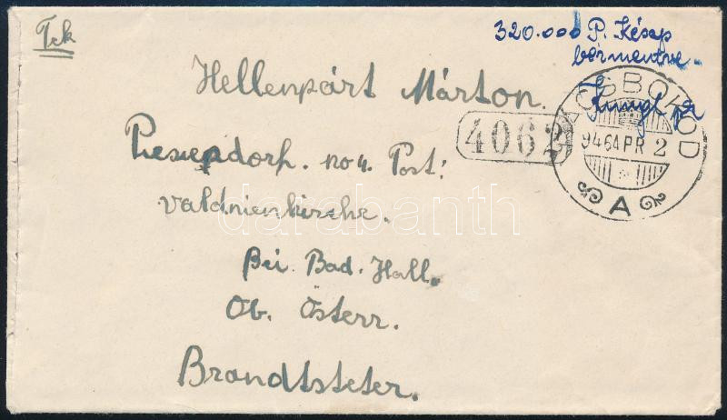 Beschreibung: 1946 (11. díjszabás) Levél 320.000P készpénzes bérmentesítéssel Bácsbokodról Ausztriába