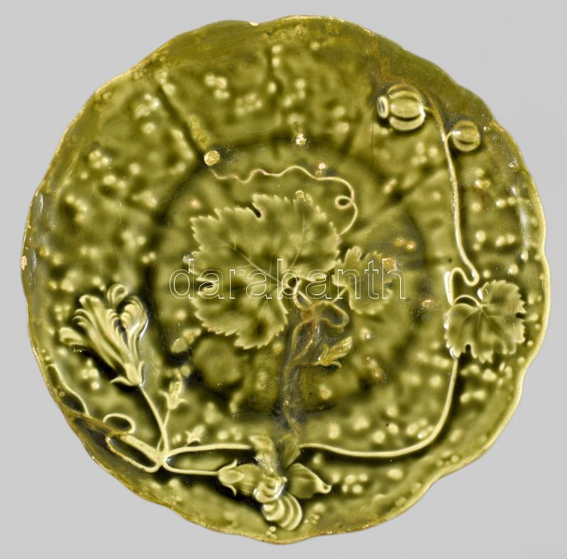 Beschreibung: Schütz Cilli szőlőlevél mintás fajansz tányér, Jelzett, javított d: 20 cm