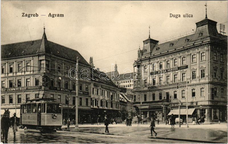 1915 Zagreb, Zágráb; Duga ulica / utca, villamos, Dr. Milivoj Jambrisak és Dr. Ziga Hercog fogorvosi rendelők, üzletek / street view, tram, shops, dentists' offices