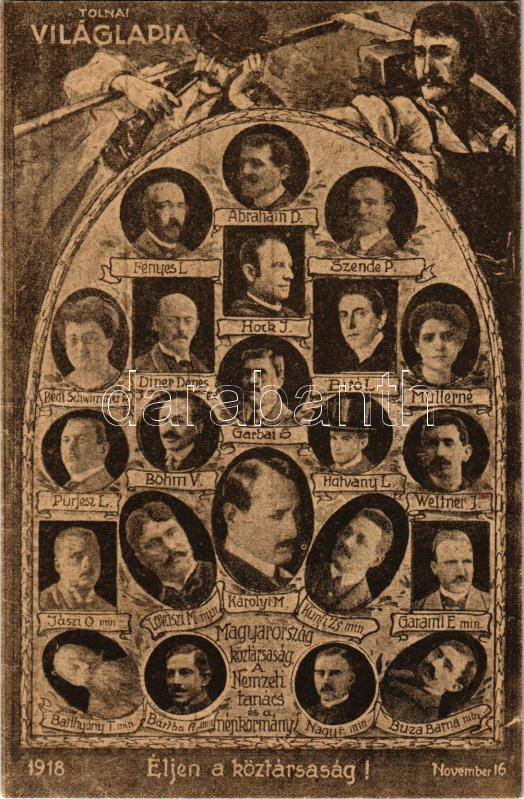 1918 November 16. Éljen a köztársaság! Magyarország Köztársaság: A Nemzeti tanács és a népkormány (Károlyi Mihály-kormány). Tolnai Világlapja kiadása / Members of the Hungarian National Council and People's Government (fa)