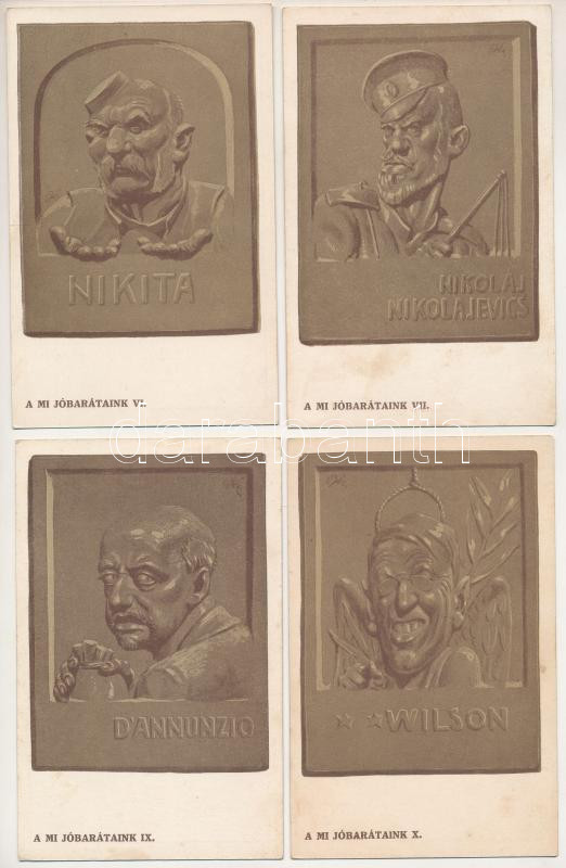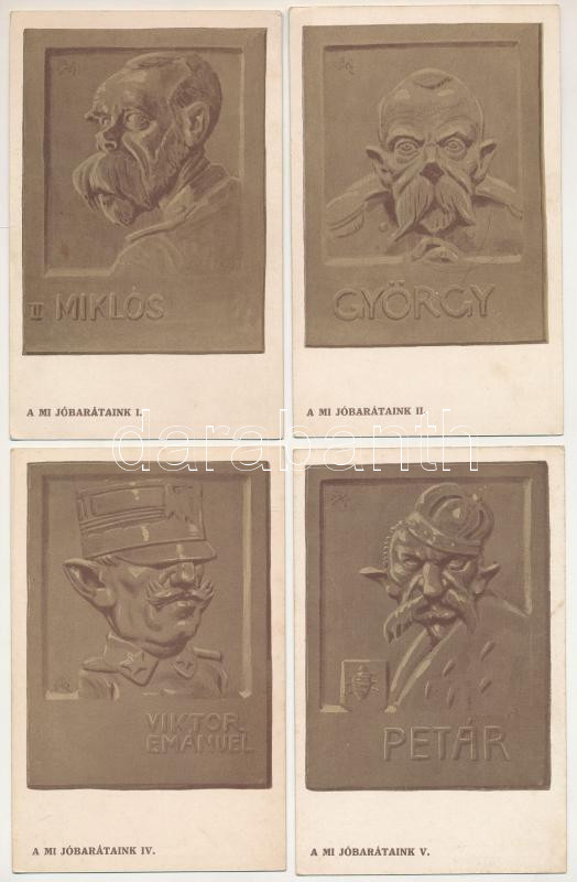 A Mi Jóbarátaink - 8 db régi első világháborús magyar propaganda képeslap, gúnyrajzok Bér szignóval. Nyomtatta és kiadja Kner Izidor / 8 pre-1945 Hungarian propaganda postcards, caricatures