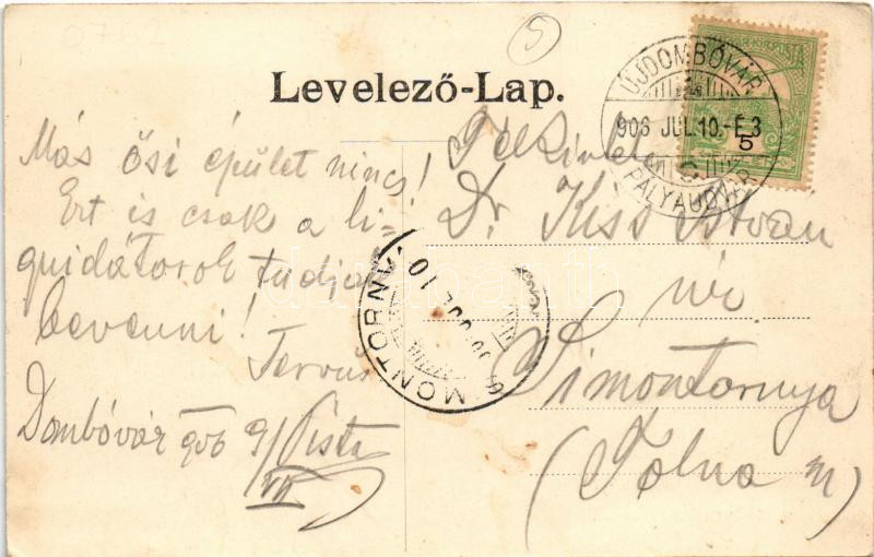 Beschreibung: 1906 Dombóvár, Korona szálloda, kávéház, szekér. Bruck Sándor kiadása. + "ÚJDOMBÓVÁR PÁLYAUDVAR" (EK)