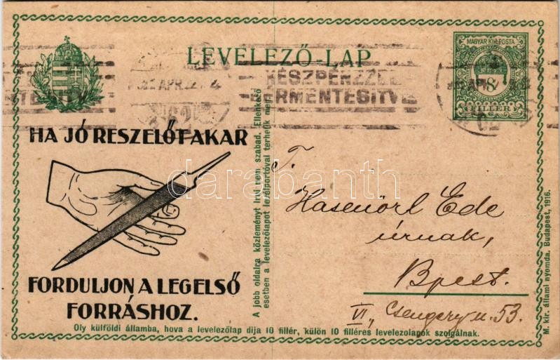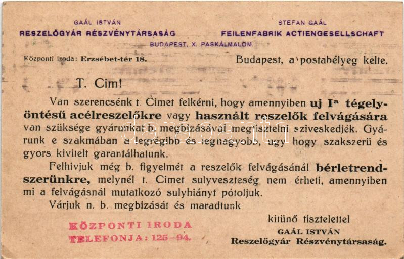 Ha jó reszelőt akar, forduljon a legelső forráshoz. Gaál István reszelőgyára reklám, hátoldalon is. Budapest, Paskál-malom / Hungarian rasp factory advertisement on the foreside and backside (non PC) (EK)