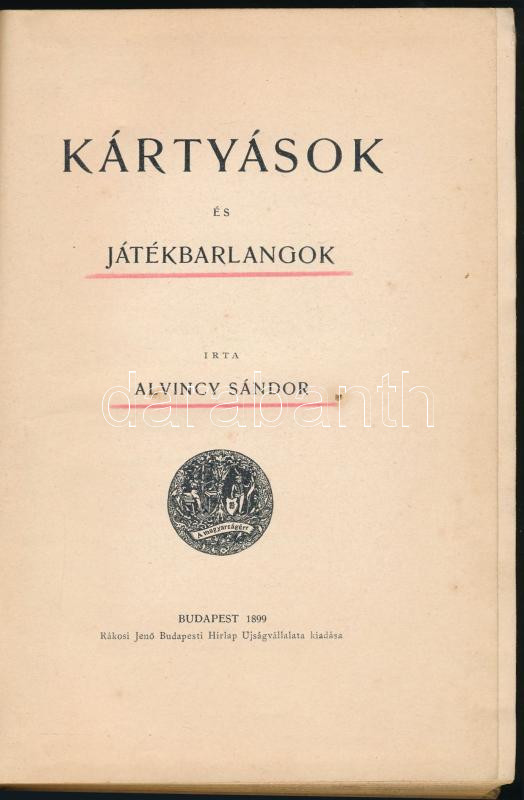 Alvincy Sándor: Kártyások és játékbarlangok. Bp., 1899, Rákosi Jenő. K... https://www.darabanth.com/de/512-Fernauktion/512.0/Bucher/Bucher-Andere-kuriositaten~690/Alvincy-Sandor-Kartyasok-es-jatekbarlangok-Bp-1899-Rakosi-Jeno-Kiadoi-egeszvaszon-k~II3460094