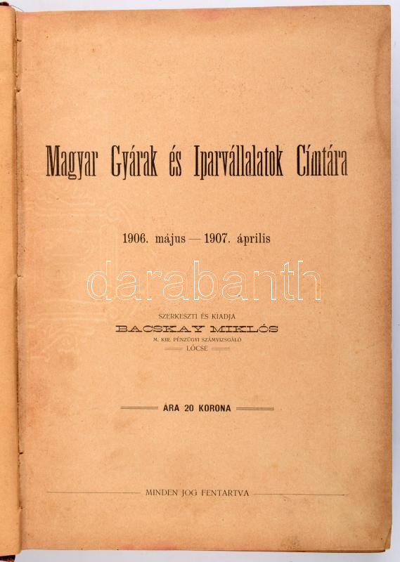 Bacskay Miklós: Magyar Gyárak és Iparvállalatok Címtára. 1906. május - 1907. április. Szerk. és kiadja: - - . Lőcse, 1906, Szepesvármegyei közigazgatási-ny. 685+(3) p. Félvászon-kötésben, viseltes, kopottas borítóval, a gerincen kisebb sérülésekkel, helyenként kisebb lapszéli sérülésekkel. (Ritka!)