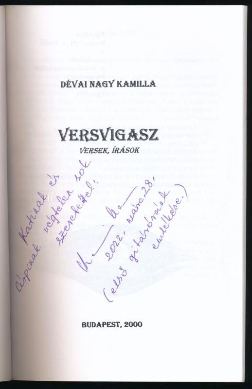 Dévai Nagy Kamilla: Versvigasz. Versek, írások. A szerző, Dévai Nagy Kamilla (1950- ) Liszt Ferenc-díjas énekes, előadóművész által dedikált példány. Bp., 2000, Művészetbarátok Egyesülete, 86+(8) p. Kiadói papírkötés.