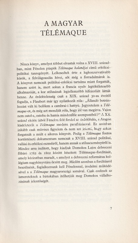 Francois de Fénelon francia püspök "Les Aventures de Télémache" (1699) című barokk államregénye a XVIII. század legnépszerűbb prózai alkotása. Az ókori díszletek közé helyezett kalandregény során az ifjú hős, Odüsszeusz gyermeke, a királyi sarj Telemakhosz beutazza a Földközi-tengert, tengernyi különféle államformával találkozik, hajótöréseket szenved, kalandokban van része, és közben a helyes és helytelen államberendezés elveiről kap útbaigazítást. A francia felvilágosodás fontos államregénye a XVIII. század folyamán három teljes magyar fordítást, mi több, egy verses kivonatot is nyer, e fordítások elsőjét, Haller László 1755-ben kiadott magyar változatát a gyér számú, ám lelkes hazai olvasóközönség olvasta és magasztalta. Húsz év múlva Zoltán József, majd a századfordulón a debreceni Domokos Lajos is lefordította, igaz, nyelvújítási szépségekben gazdag fordítása kéziratban maradt. A barokk államregény Domokos-féle fordításának ez az első kiadása. Regényfejezeteink előtt egész oldalas illusztrációk, a munka előtt Köpeczi Béla tanulmánya.