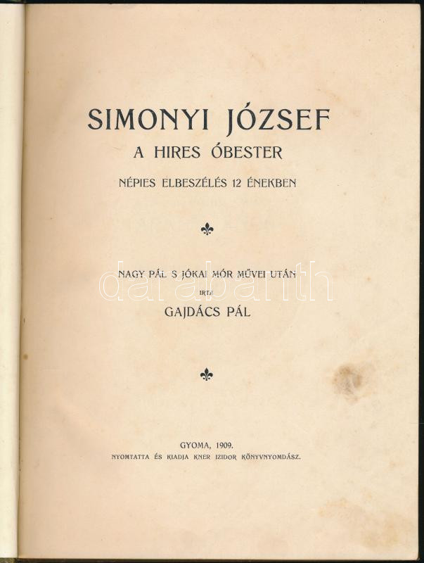 Gajdács Pál: Simonyi József, a híres óbester. Népies elbeszélés 12 énekben. Nagy Pál s Jókai Mór művei után írta: - - . Garay Ákos illusztrációival. Gyoma, 1909, Kner Izidor, 1 t.+ 142+(2) p. Kiadói egészvászon kötés, helyenként kissé foltos lapokkal.