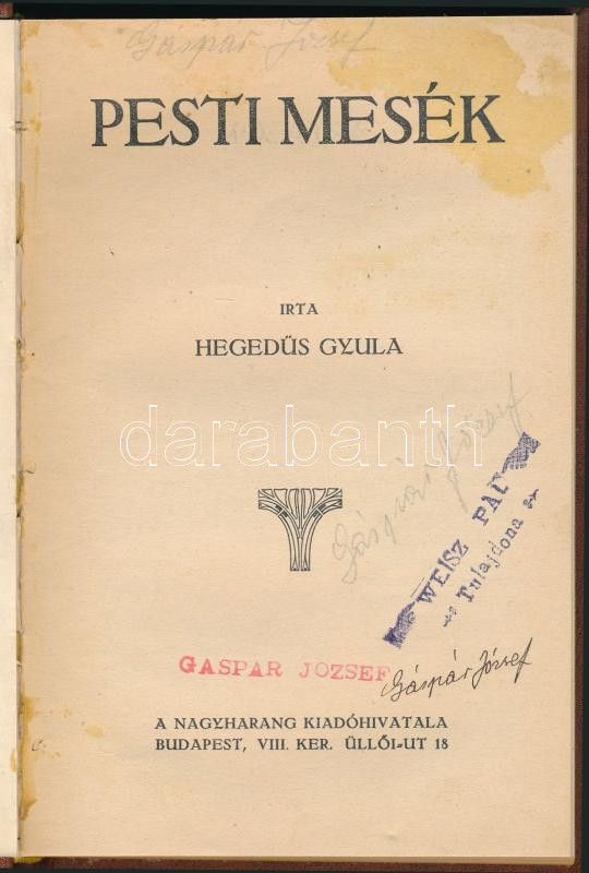 Hegedüs Gyula: Pesti mesék. Nagyharang. Ujságirók könyvtára 3. sz. Bp., [1912], Nagyharang, 128 p. Átkötött műbőr-kötésben, néhány kissé foltos lappal, tulajdonosi névbejegyzésekkel és bélyegzőkkel.