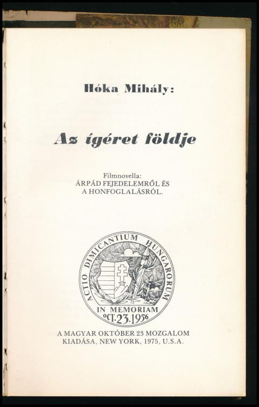 Hóka Mihály: Az ígéret földje. Filmnovella Árpád fejedelemről és a honfoglalásról. A szerző által dedikált példány (,,Pásztor Lászlónak rabtársi üdvözlettel Hóka Mihály"). New York, 1975, Magyar Október 23 Mozgalom. Emigráns kiadás. Kiadói kartonált papírkötés, kissé koszos borítóval, kissé sérült kiadói papír védőborítóban.