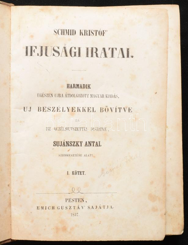Schmid Kristóf ifjúsági iratai I-II. Pest, 1847, Emich Gusztáv. Félvás... https://www.darabanth.com/de/512-Fernauktion/512.0/Bucher/Bucher-Andere-kuriositaten~690/Schmid-Kristof-ifjusagi-iratai-I-II-Pest-1847-Emich-Gusztav-Felvaszon-kotes-gerinc-ser~II3460456