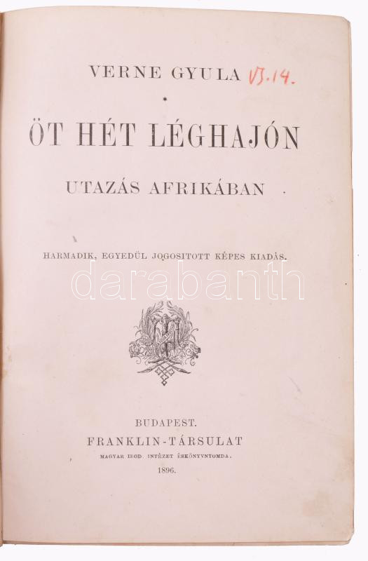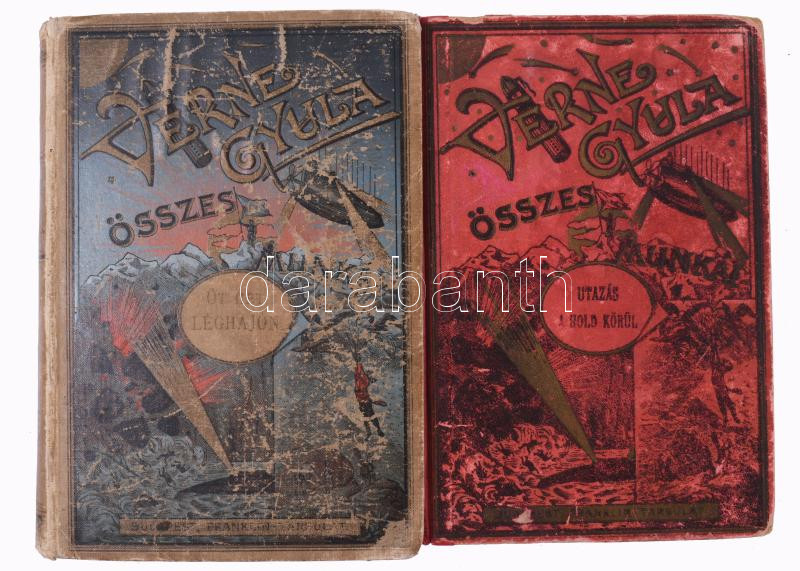 Verne Gyula 2 regénye: Öt hét léghajón. Utazás Afrikában. Bp., 1896, Franklin-Társulat. Kiadói egészvászon-kötés, viseltes borÃtóval, helyenként kissé koszos, foltos lapokkal. + Utazás a Hold körül. Ford.: Gaal Mózes. Bp., 1923, Franklin-Társulat. Kiadói félvászon-kötés, viseltes borÃtóval, helyenként kissé foltos lapokkal, tulajdonosi bélyegzÅ‘kkel.