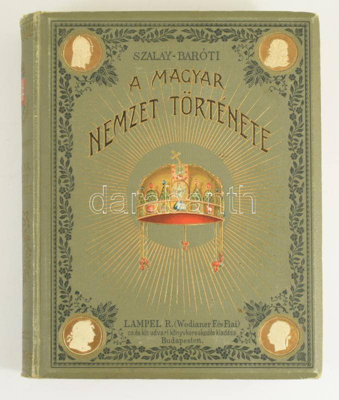 Dr. Szalay József - Dr. Baróti Lajos: A Magyar Nemzet története. I. kötet. Magyarország az Árpádház kihaltáig. Bp., Lampel. Kiadói festett, aranyozott egészvászon kötés, színezett lapélek, címlap szakadt, kopottas állapotban.