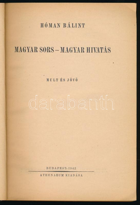 Hóman Bálint: Magyar sors - magyar hivatás. Mult és jövő. Bp., 1942, A... https://www.darabanth.com/de/512-Fernauktion/512.0/Bucher/Bucher-Geschichte~670/Homan-Balint-Magyar-sors-magyar-hivatas-Mult-es-jovo-Bp-1942-Athenaeum-4-sztl-levplus-~II3462786