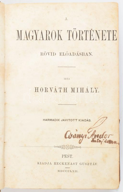 Horváth Mihály: A magyarok története rövid előadásban. Pest, 1862, Heckenast Gusztáv, 586+(4) p. Harmadik, javított kiadás. Félvászon-kötésben, kopott borítóval, kissé foltos lapokkal, tulajdonosi névbejegyzéssel, az elülső szennylapon kézzel írt jegyzetekkel (,,Magyarország őslakói [...]").