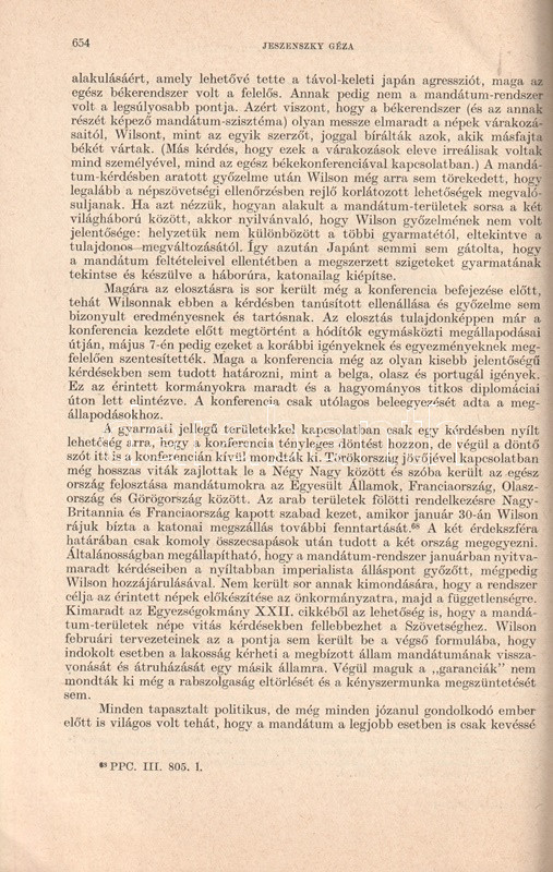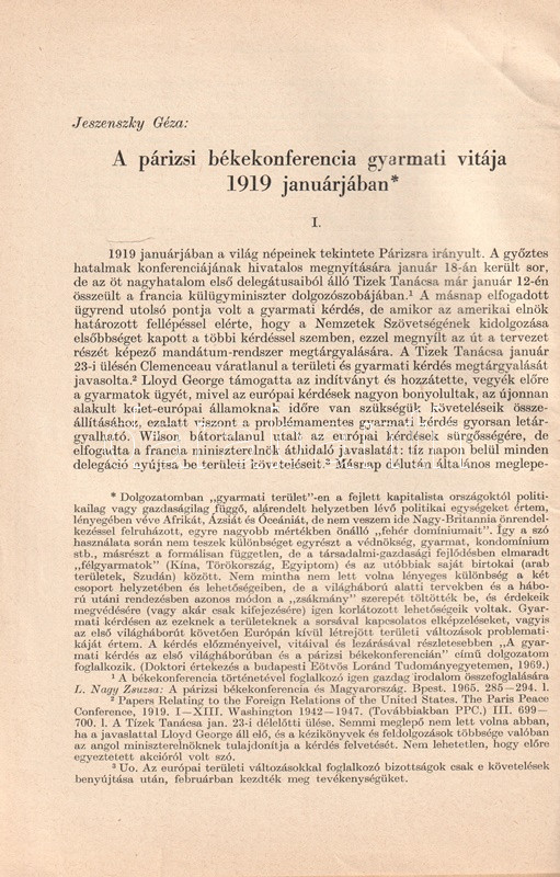Jeszenszky Géza (sz. 1941) történész, egyetemi oktató, szerkesztő; a rendszerváltó nemzedék konzervatív köreinek befolyásos tagja, politikus, külügyminiszter, nagykövet. Fő kutatási területe a XIX. és XX. századi egyetemes és magyar történelem. Rövid dolgozatában a Párizs környéki békék gyarmati vitáit elemzi: a viták során a wilsoni elvek ütköztek a győztes hatalmak annektálási törekvéseivel; az osztozkodás során végül nem annektálások történtek, hanem mandátumterületeket alakítottak ki az egykori vesztes hatalmak gyarmati területeiből.