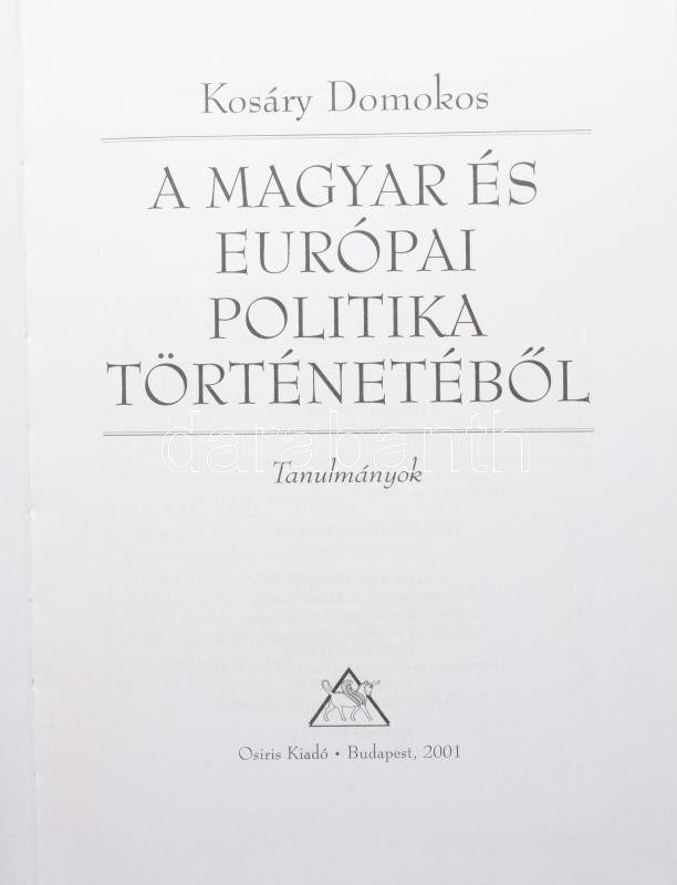 Kosáry Domokos: A magyar és európai politika történetéből. Tanulmányok. Millenniumi Magyar Történelem. Historikusok. Bp., 2001, Osiris. Kiadói kartonált papírkötés, karcos borítóval.