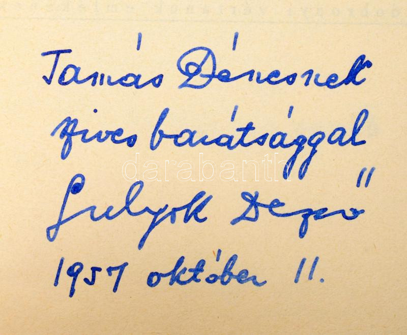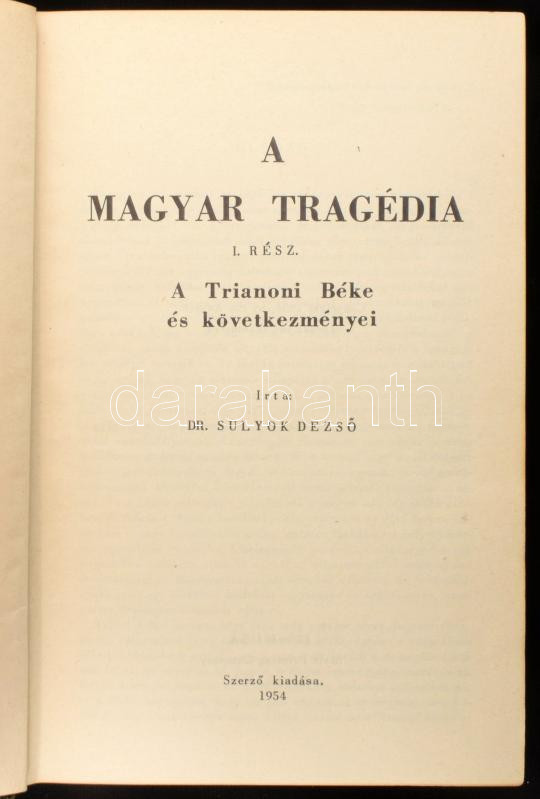 Sulyok Dezső: A magyar tragédia. I. rész. A Trianoni Béke és következményei. A szerző, Sulyok Dezső (1897-1965) politikus, országgyűlési képviselő, Pápa város polgármestere által dedikált példány. Newark, 1954, szerzői kiadás, 624 p. Első kiadás. Emigráns kiadás. Kiadói egészvászon-kötés, sérült, ragasztott (részben az elülső borítóhoz ragadt) kiadói papír védőborítóban.