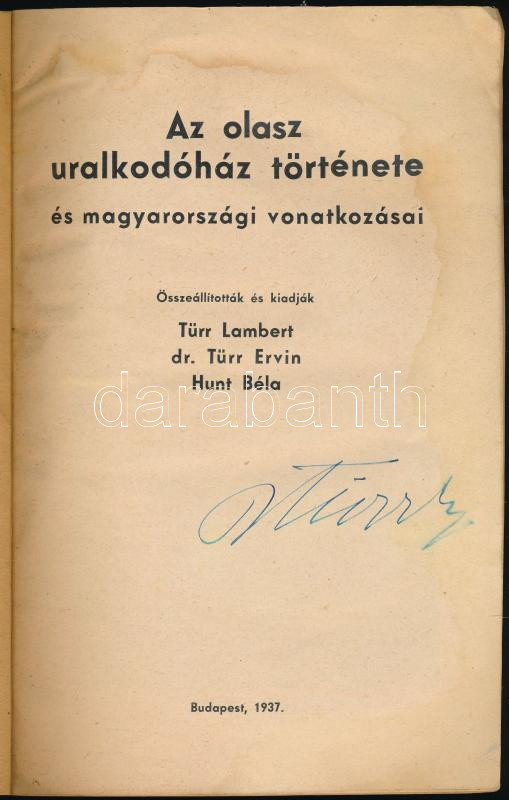 Türr-Dr. Türr-Hunt: Az olasz uralkodóház története és magyarországi vonatkozásai. Bp., 1937. ALÁÍRT! Kiadói papírkötés, lapokon ázásnyomokkal, kopottas állapotban.