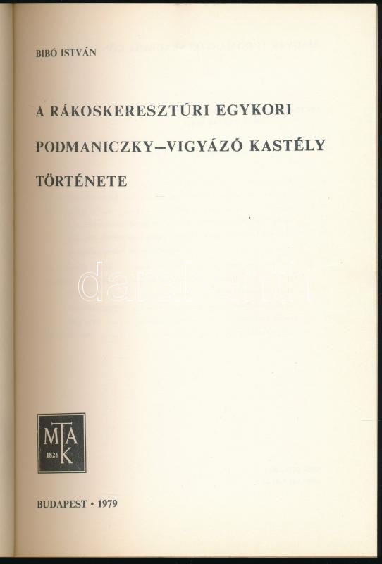 Bibó István: A rákoskeresztúri egykori Podmaniczky-Vigyázó kastély története. A Magyar Tudományos Akadémia Könyvtárának közleményei - Új sorozat 8. (83.) sz. Bp., 1979, MTA Könyvtára, 84+(6) p. Fekete-fehér fotókkal illusztrálva. Kiadói papírkötés. Megjelent 800 példányban.