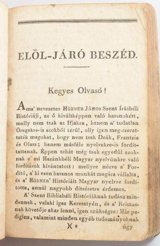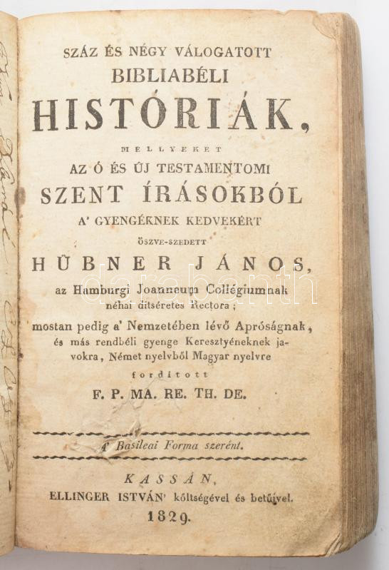 Hübner, [Johann] János: Száz és négy válogatott Bibliabeli Históriák, mellyeket az Ó és Új Testamentumi Szent írásokból a' gyengéknek kedvekért öszve-szedett - -, ... fordította F. P. MA. RE. TH. De. Kassán, 1829, Ellinger István költségével és betűivel, 12+484 p.