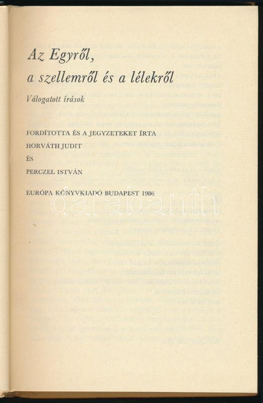 Plótinosz: Az Egyről, a szellemről és a lélekről. Válogatott írások. Ford. és a jegyzeteket írta: Horváth Judit és Perczel István. Bp., 1986, Európa. Kiadói kartonált papírkötés.