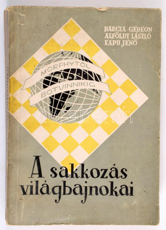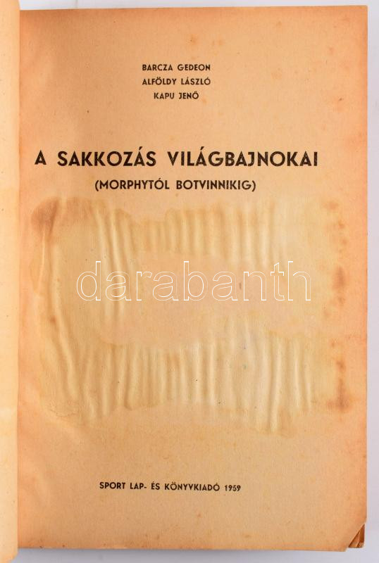 Barcza-Alföldy-Kapu: A sakkozás világbajnokai (Morphytól Botvinnikig). Bp., 1959, Sport. Kiadói papírkötés, papír védőborítóval, első lapokon ázásnyomokkal, szamárfüles oldalakkal, kopottas állapotban.