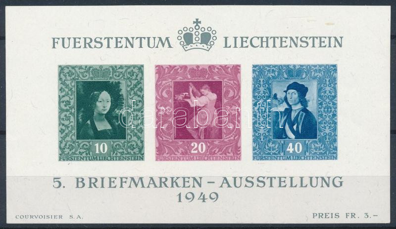 Liechtenstein 1949 Bélyegkiállítás kisív Mi 5 (Mi EUR 140.-) https://www.darabanth.com/de/512-Fernauktion/512.0/Erlesene-Lose-und-Sammlungen-Ausland/Einzelne-Gebotslose-Weltweit~595/Liechtenstein-1949-Belyegkiallitas-kisiv-Mi-5-Mi-EUR-140-~II3462725