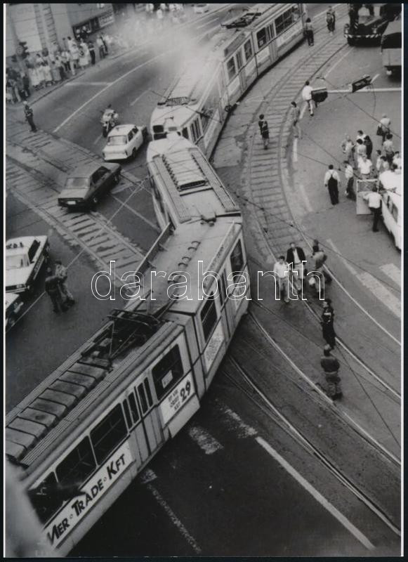 Beschreibung: 1990 "Irány a Rózsadomb", kisiklott villamos a Margit-körúton, 1 db modern nagyítás, jelzés nélkül, 21x15 cm