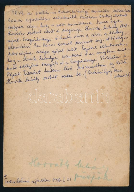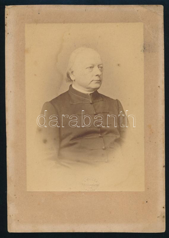 cca 1870 Horváth Mihály Imre (1809-1878) történész, püspök portréja. Katolikus püspök Csanádon 1848-1849 közt, 1877-1878 közt a Magyar Történelmi Társulat elnöke. 1848 júliusában V. Ferdinánd király csanádi püspökké nevezte ki, de sosem szentelték föl, a függetlenségi nyilatkozat után vallás- és közoktatásügyi miniszterhelyettes lett. A szabadságharc leverése után előbb Magyarországon bujdosott, majd főúri közbenjárásra Lipcsébe majd Belgiumba menekült. A haditörvényszék halálra ítélte és in effigie fel is akasztatta. 18 évig száműzetésben élt. J. Heller műterméből, 18,5x13 cm