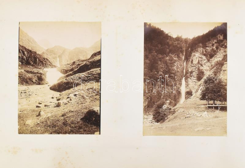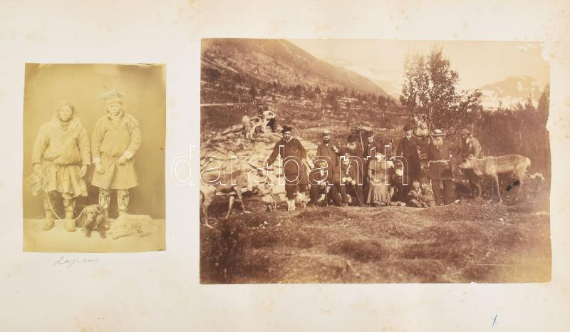 cca 1890-1900 Scandinavian landscapes and images of life from the ent of the XIX. century, 4 pc.: Sami ethnographic photo, and a group photo of Norwegian people, 2 pieces of unknown waterfall, photo on board, with spotty, partly notice, with a little lack in the corner of one of the photos, 14x10 cm, 19x26 cm and 16x12 cmx2