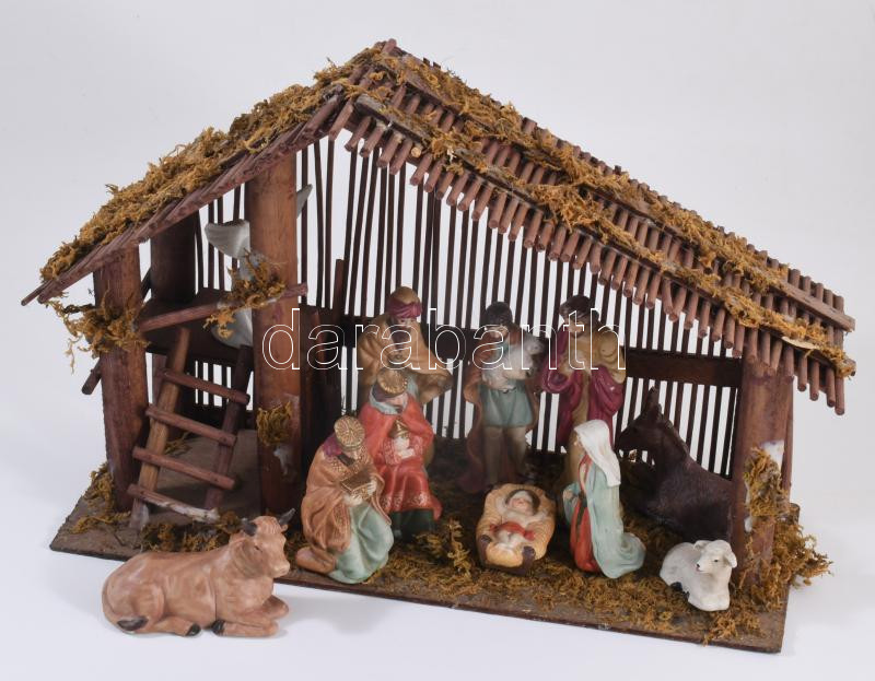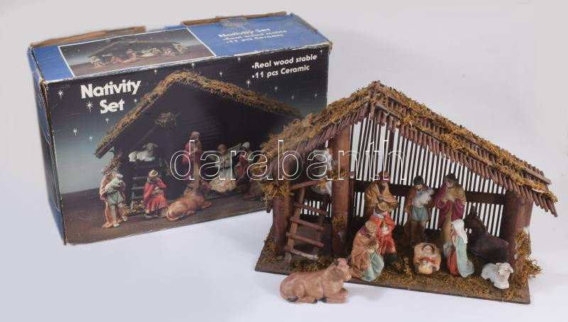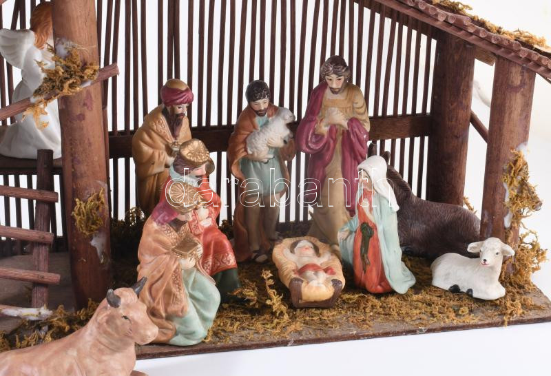 Beschreibung: Betlehemi jászol, 11 darab porcelán figurával (egyik sérült), dobozában, 40x26 cm