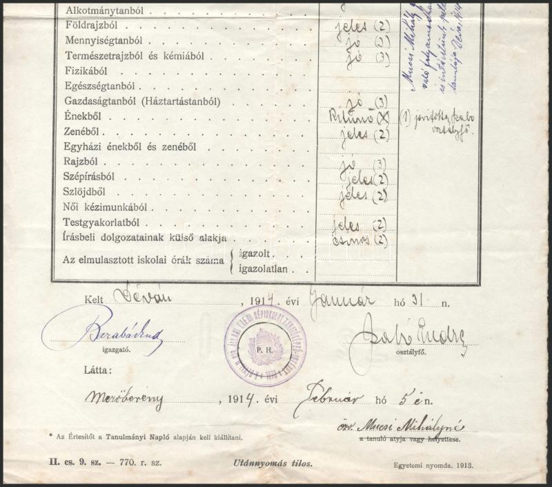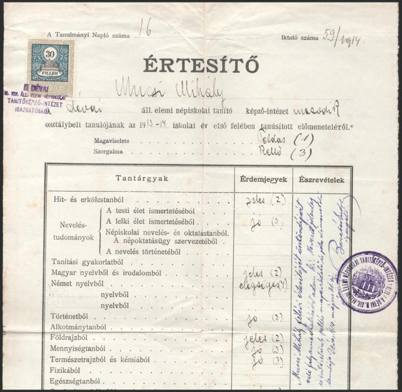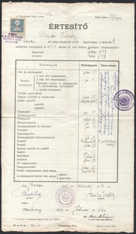 1914 Déva, Mezőberény, Dévai iskolai értesítő illetékbélyeggel https://www.darabanth.com/de/512-Fernauktion/512.0/Kunst-Dokumente-andere-Sammelgebiete/Dokument~651/1914-Deva-Mezobereny-Devai-iskolai-ertesito-illetekbelyeggel~II3457606