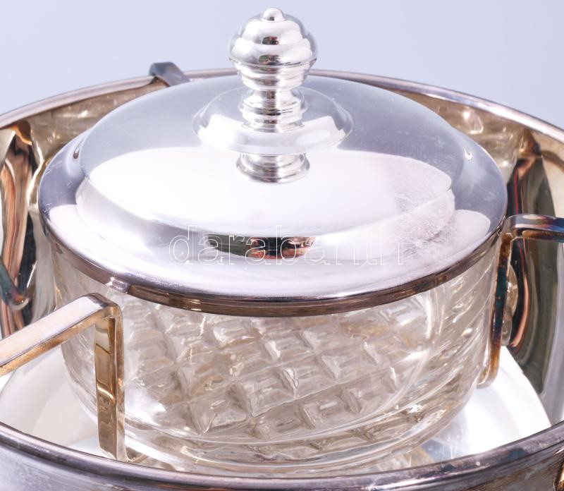 Beschreibung: Ezüstözött kaviártartó üvegbetéttel, eredeti gyári dobozában. Manucfatura Wolff Soppil. d:20cm, m:12cm