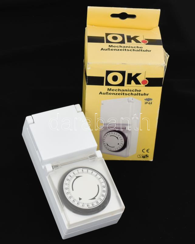 Beschreibung: Mechanikus időzítős kapcsoló, dobozában.