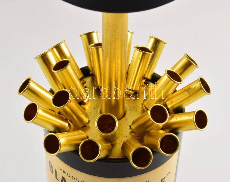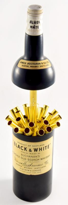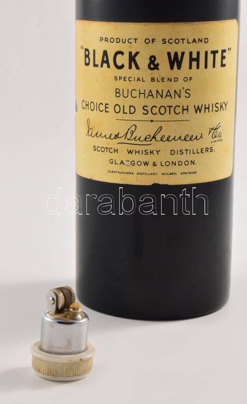 cca 1970 James Buchanan & Co. cigarettakínáló, üveg felső részét széthúzva cigarettakínáló résszel, kupakban öngyújtó, jelzett, kopással, bakelit, m: 28 cm