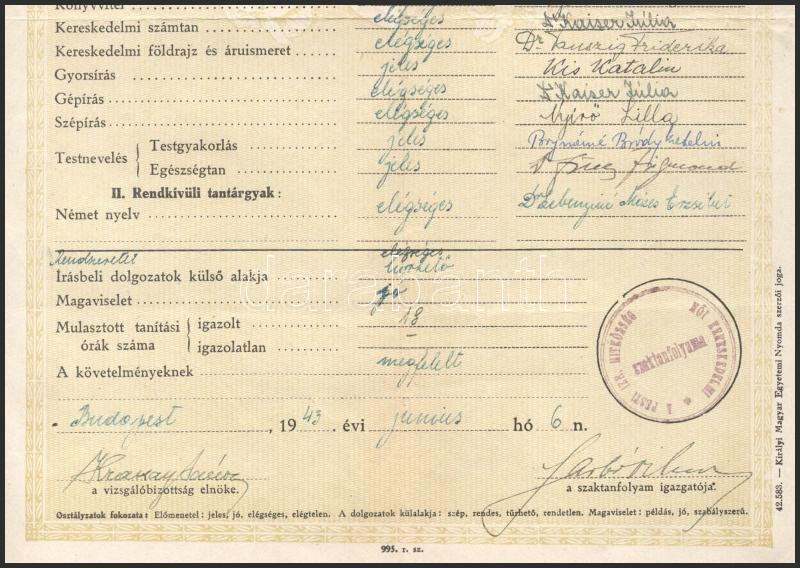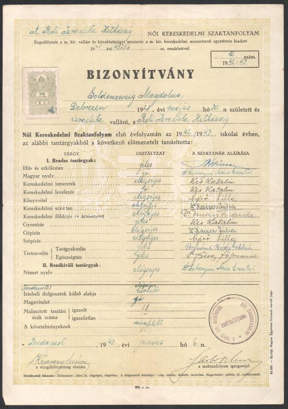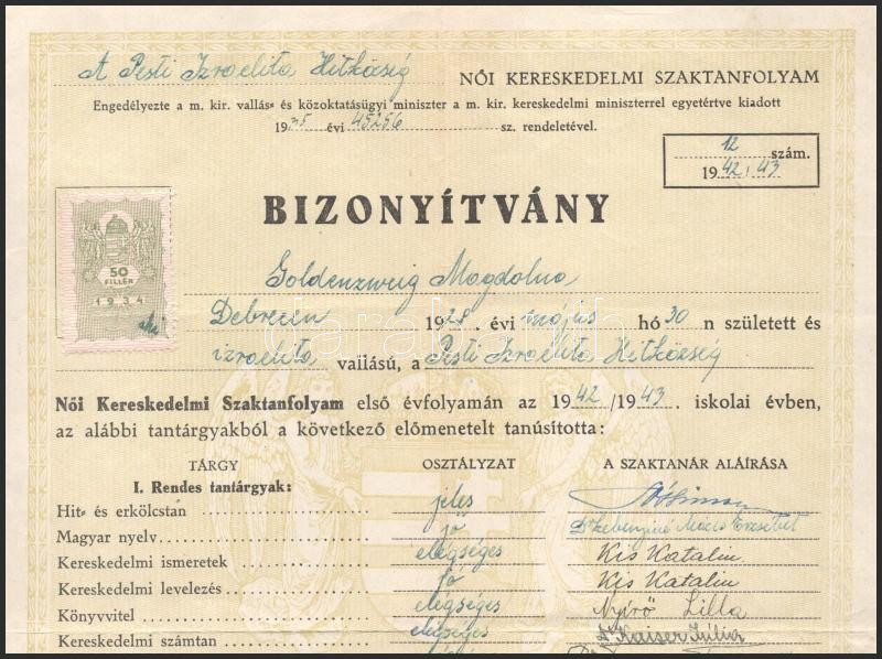 1943 Bp., Pesti Izraelita Hitközség kereskedelmi szaktanfolyam bizonyí... https://www.darabanth.com/de/512-Fernauktion/512.0/Kunst-Dokumente-andere-Sammelgebiete/Judaica~657/1943-Bp-Pesti-Izraelita-Hitkozseg-kereskedelmi-szaktanfolyam-bizonyitvany~II3457610