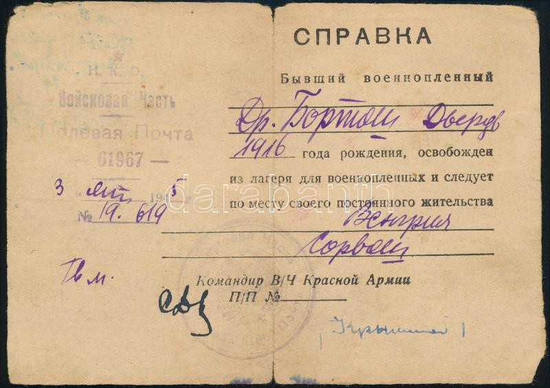 1945 Orosz nyelvű igazolás magyar hazafelé tartó hadifogoly részére, h... https://www.darabanth.com/de/512-Fernauktion/512.0/Kunst-Dokumente-andere-Sammelgebiete/Militaria~661/1945-Orosz-nyelvu-igazolas-magyar-hazafele-tarto-hadifogoly-reszere-hatoldalon-szamos-roma~II3461280