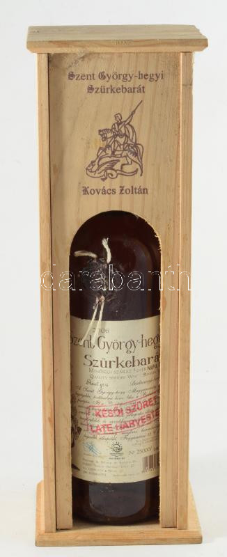 Beschreibung: 2006 Szent György-hegyi Szürkebarát, késői szüret, bontatlan palack száraz fehérbor, 0,75 l, fadobozban