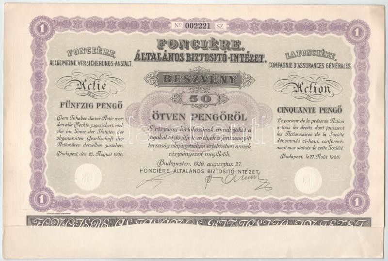 1926. Budapest "Fonciére Általános Biztosító-Intézet" részvé... https://www.darabanth.com/de/512-Fernauktion/512.0/Numismatik/Aktien-und-Tickets~233/1926-Budapest-3Cem3EFonciere-Altalanos-Biztosito-Intezet3Cem3E-reszvenye-50P-rol-szarazpe~II3439029