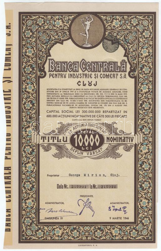 Romania 1946. Cluj "Banca Centrala pentru industrie si comert societate pe actii Cluj" Central Bank of Industry and Commerce of Cluj, twenty shares in one, with the shareholder's name, all about 10.000 Lei, with embossed stamp, cancellation and coupons C:AU