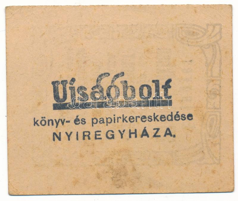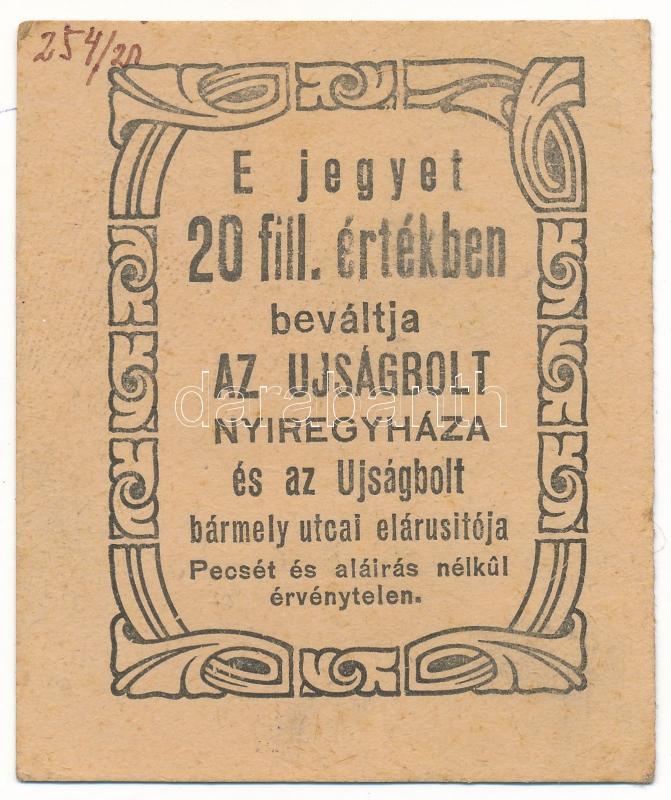 1920 k. Nyíregyháza "Az Ujságbolt" 20f értékű utalvány, vilá... https://www.darabanth.com/de/512-Fernauktion/512.0/Numismatik/Notgeld-aus-Papier-und-Metall~234/1920-k-Nyiregyhaza-Az-Ujsagbolt-20f-erteku-utalvany-vilagos-papir-TAU3Cbr-3E-Adamo-NYC3~II3462841