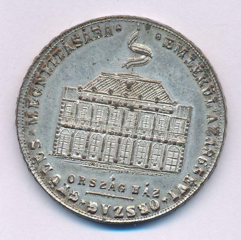 1865. "Az 1865. évi Országgyűlés megnyitása" ezüstözött bronz emlékérem "ÉLJEN A HAZA - ES LEBE DAS VATERLAND / EMLÉKÜL AZ 1865. ÉVI ORSZÁG GYÜLÉS MEGNYITÁSÁRA PESTEN - ORSZÁG HÁZ" (38mm) T:XF patina