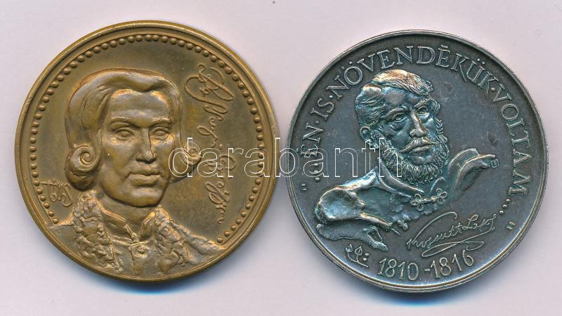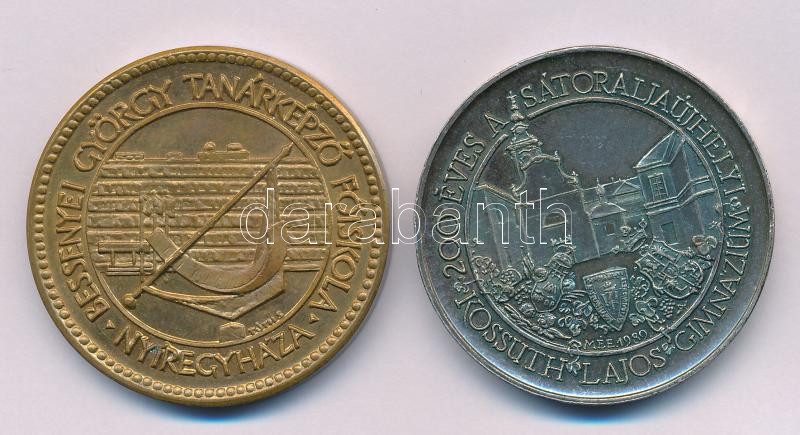 Beschreibung: Sebestyén Sándor (1949-2010) 1989. "MÉE - 200 éves a sátoraljaújhelyi Kossuth Lajos Gimnázium / '... Én is a növendékük voltam...' 1810-1816 " ezüstözött bronz emlékérem (42,5mm) + Tóth Sándor (1933-2019) DN "Bessenyei György TanárképzÅ‘ FÅ‘iskola NyÃregyháza " kétoldalas bronz emlékérem (42,5mm) T:XF, patina