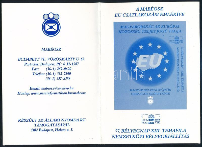 2004 Magyarország az Európai Közösség teljes jogú tagja vágott emlékív... https://www.darabanth.com/de/512-Fernauktion/512.0/Philatelie-und-Postgeschichte-Ungarn/Gedenkbogen~647/2004-Magyarorszag-az-Europai-Kozosseg-teljes-jogu-tagja-vagott-emlekiv-hatoldalan-AJAND~II3459695