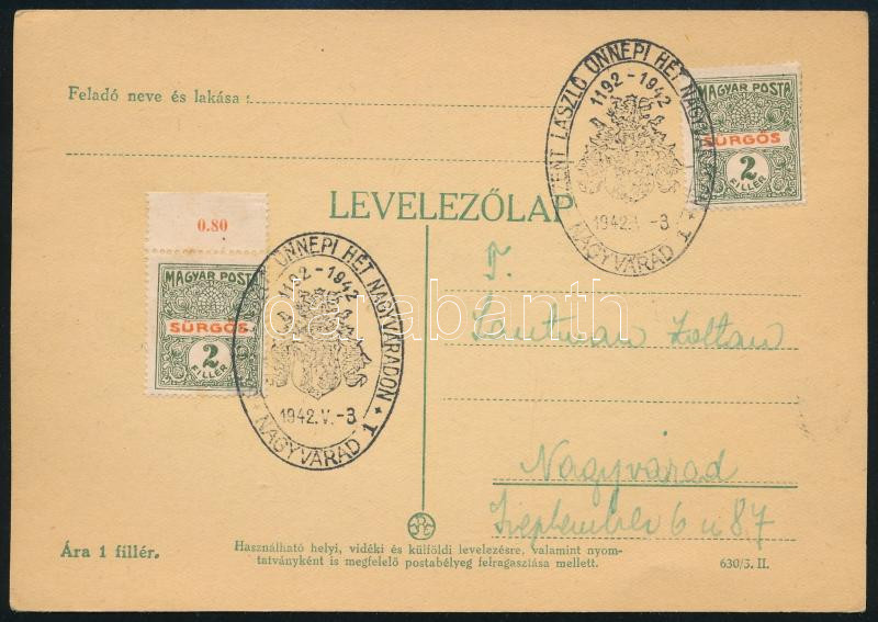 1942 Levelezőlap 2 db Sürgős 2f bélyeggel "SZENT LÁSZLÓ ÜNNEPI HÉ... https://www.darabanth.com/de/512-Fernauktion/512.0/Philatelie-und-Postgeschichte-Ungarn/Pengo-Periode-1926-1944~632/1942-Levelezolap-2-db-Surgos-2f-belyeggel-SZENT-LASZLO-UNNEPI-HET-NAGYVARADON-alkalmi-be~II3459712