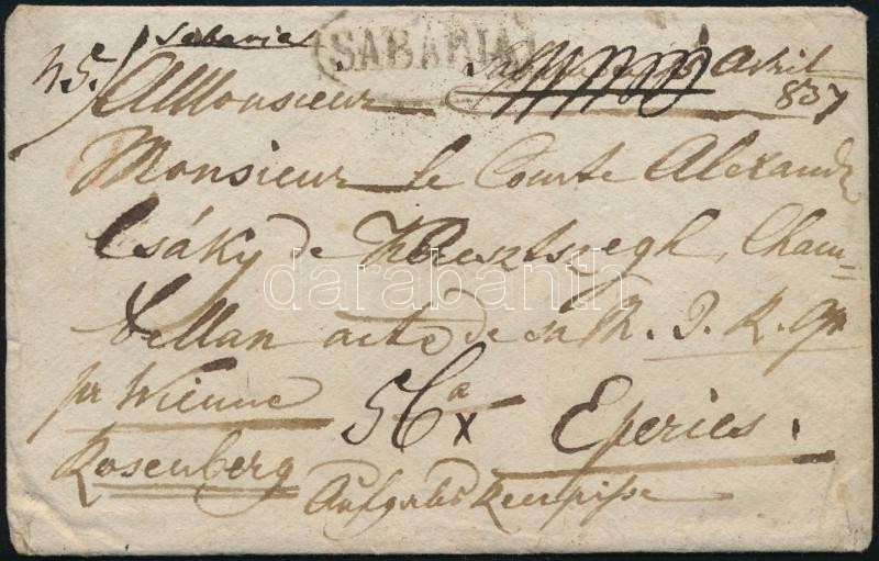 Beschreibung: 1837 Portós ajánlott levél Bécsen és Rosenbergen át Eperjesre / Unpaid registered cover through Vienna and Rosenberg to Eperjes "SABARIA"