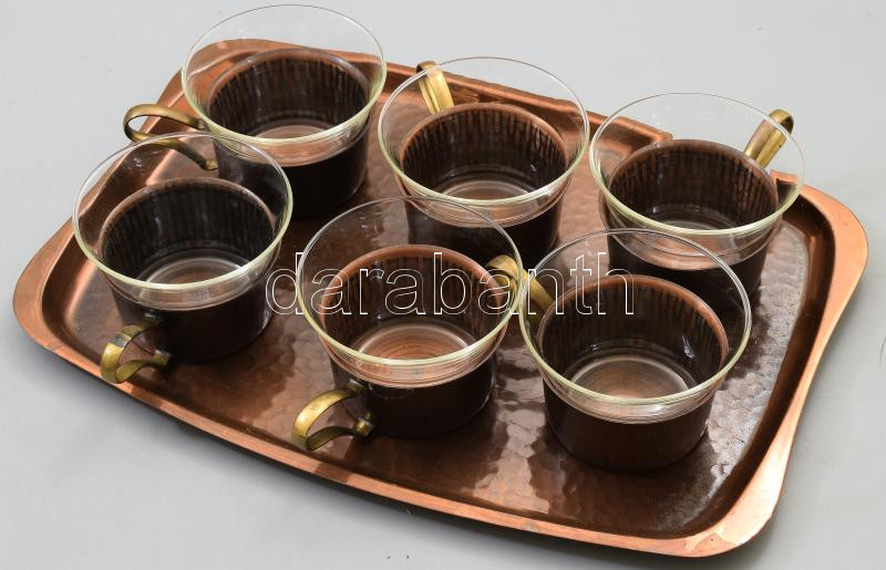 Beschreibung: 6 darabos üvegbetétes réz pohártartós pohár szett, réz tálcán, 31x19 cm, poharak m: 6,5 cm