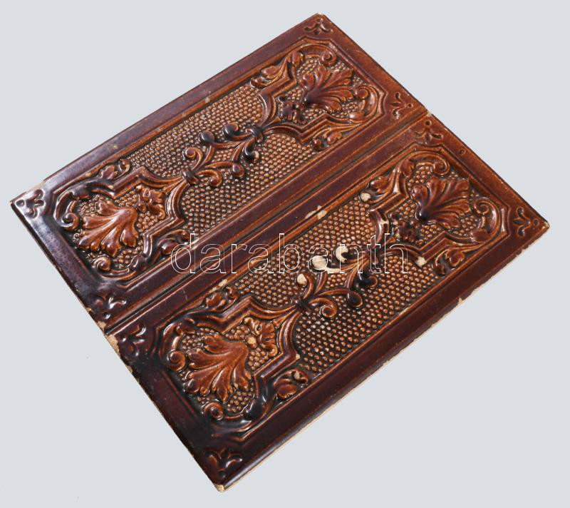 Beschreibung: cca 1895-1910 Faragó Lajos Czegléd kályhacsempe és tisztítózáró, sérüléssel, d: 12 cm, 24x22 cm